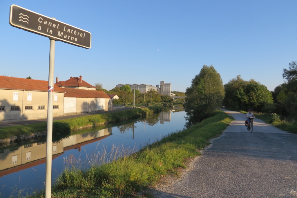 On démarre sur les vestiges de l’ancien canal au chemin du Pont Levis qu’on peut suivre 300m. Il faut alors grimper sur le talus et prendre ce qu’il reste du halage jusqu’à retrouver le nouveau bras du canal. On a ensuite un beau chemin qui nous mène par une agréable soirée automnale jusqu’à Châlons-en-Champagne.