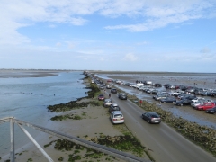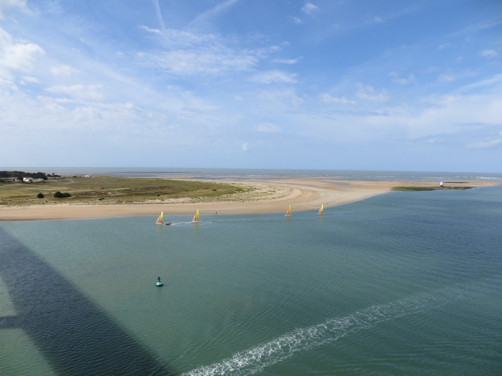 Piste pas bien signalisée le long du littoral jusqu’à Yves puis Rochefort. Pont transbordeur en panne, sommes obligés de prendre le pont routier sur la Charente. A mourir de trouille à cause des bagnoles qui vous frôlent à fond. Pourraient limiter la vitesse sur cet ouvrage avant qu’il y ait un drame.